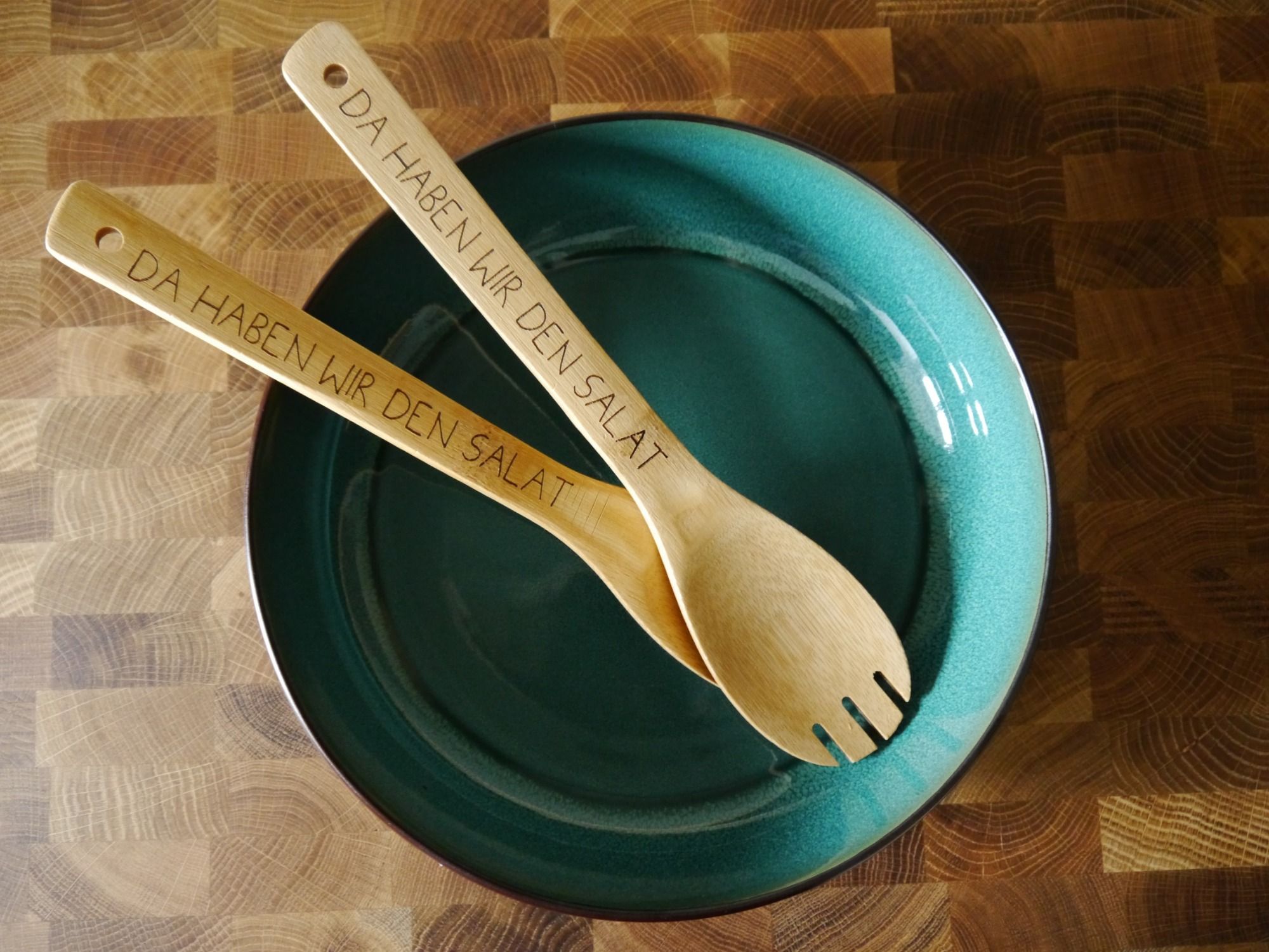 Salatbesteck aus Bambus mit Lasergravur.