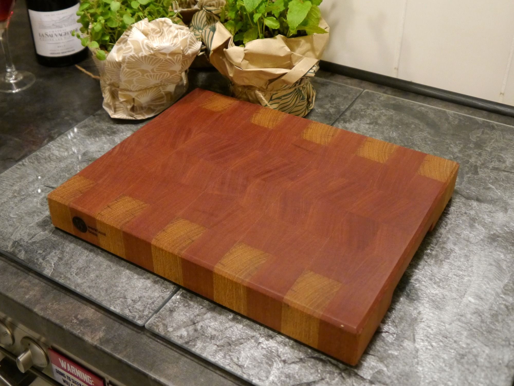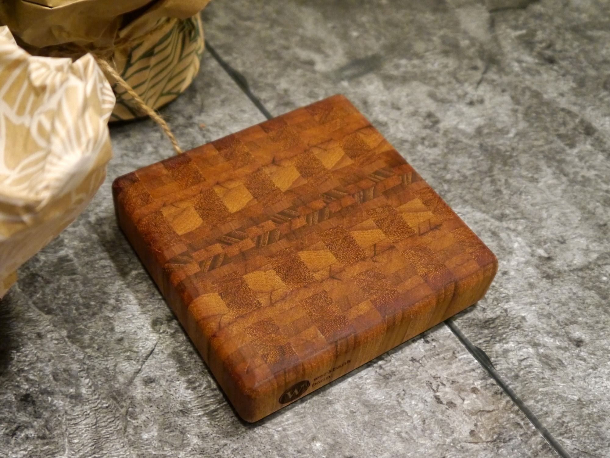 aus Abschnitten von Bangkirai (vormals Dielen) aufwendig zusammen gesetzt; ca.-Maße 130 x 125 x 30 mm; Lasermotiv optional