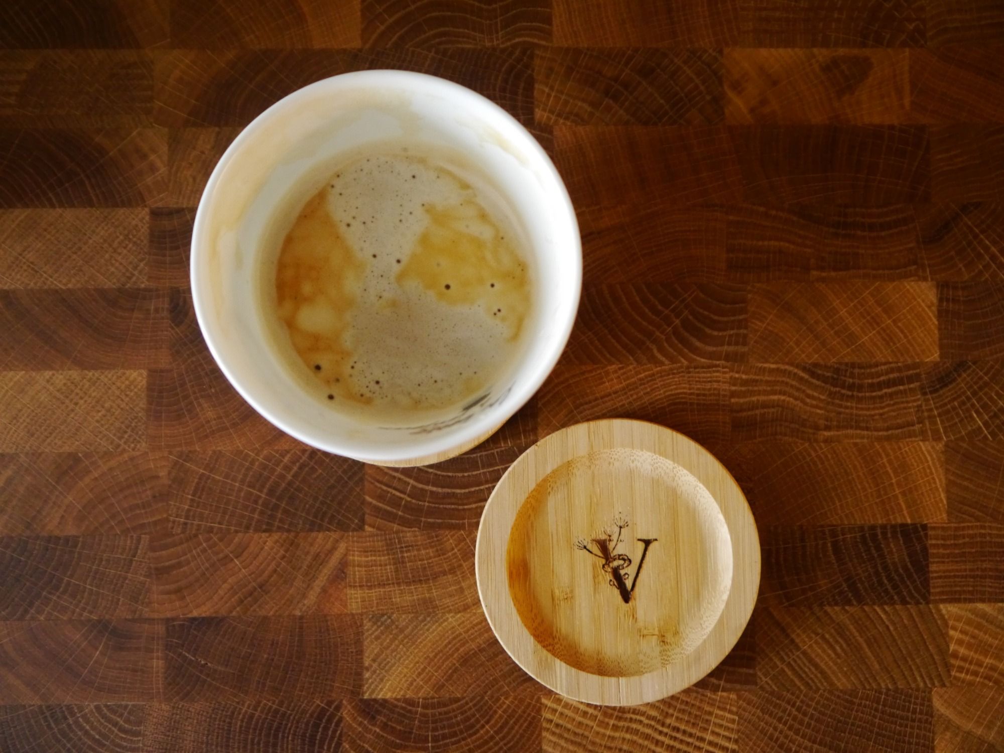 Auf-/Untersetzer aus Bambus der bei Bedarf das Getränk warm oder unerwünschte Tiere fern hält. Durchmesser ca. 9 cm
