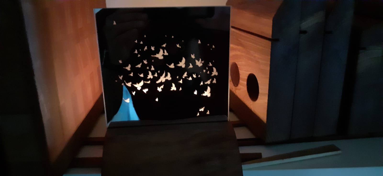 Handgefertigter Kerzenhalter aus Esche mit Motiv auf Spiegel, scheint bei Kerzenlicht durch. Versch. Motive erhältlich - auch Wunschmotiv!