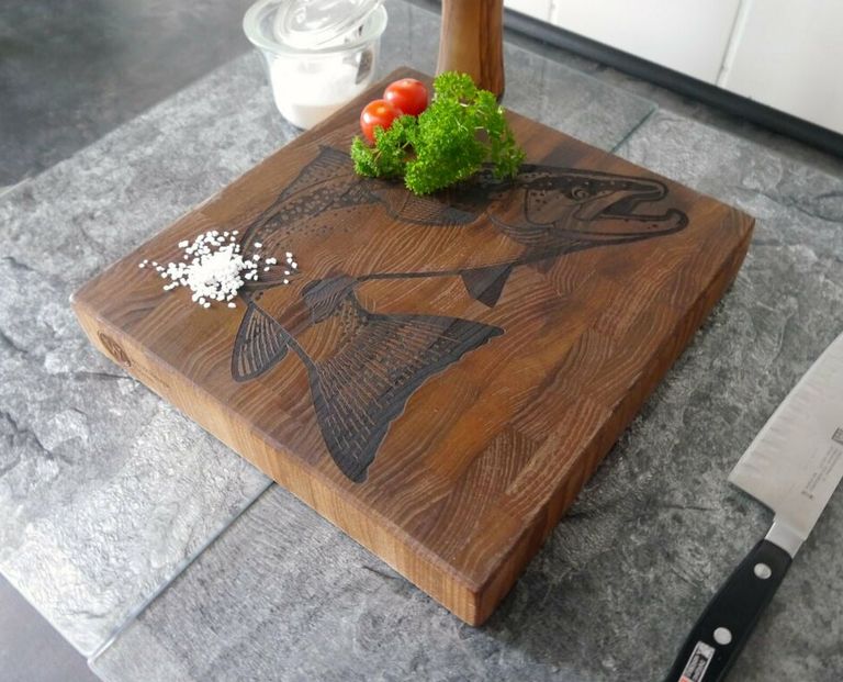 Massives Holzschneidebrett aus Thermosespe (Wandvertäfelung), handgefertigt, ca.-Format: L 310 x B 270 x H 45 mm - inkl. Lasergravur mit schönem Anglermotiv (Lachs)! € 95,00